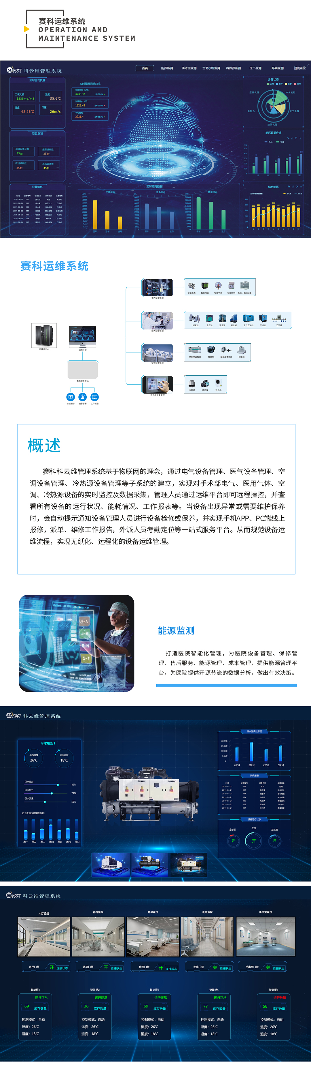 描述:賽科科云維管理系統基于物聯(lián)網(wǎng)的理念,通過(guò)電氣設備管理、醫氣設備管理、空調設備管理、冷熱源設備管理等子系統的建立,實(shí)現對手術(shù)部電氣、醫用氣體、空調、冷熱源設備的實(shí)時(shí)監控及數據采集,管理人員通過(guò)運維平臺即可遠程操控,